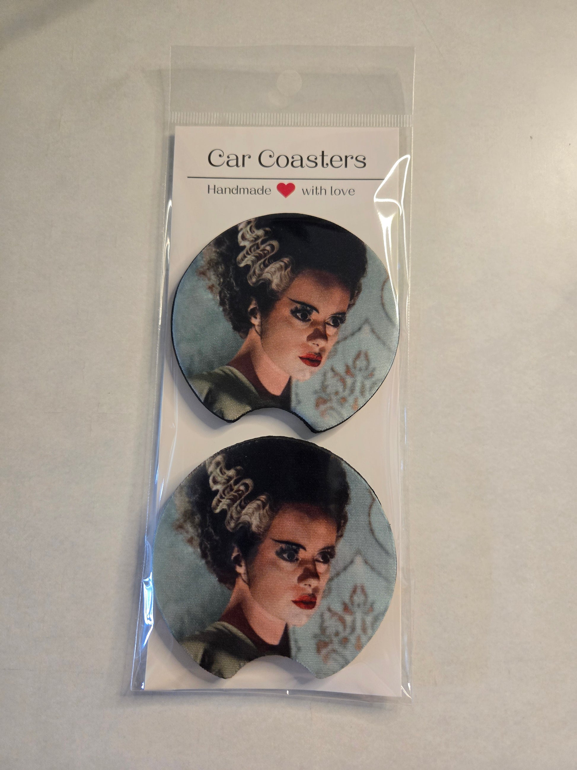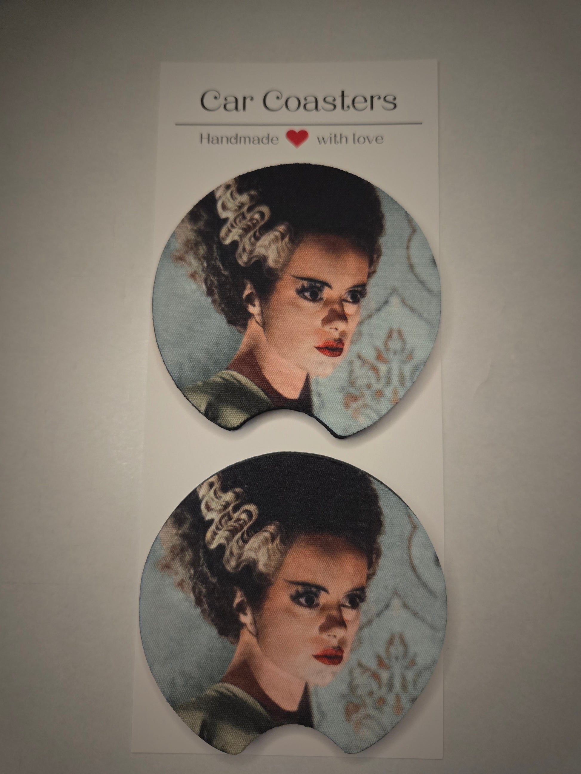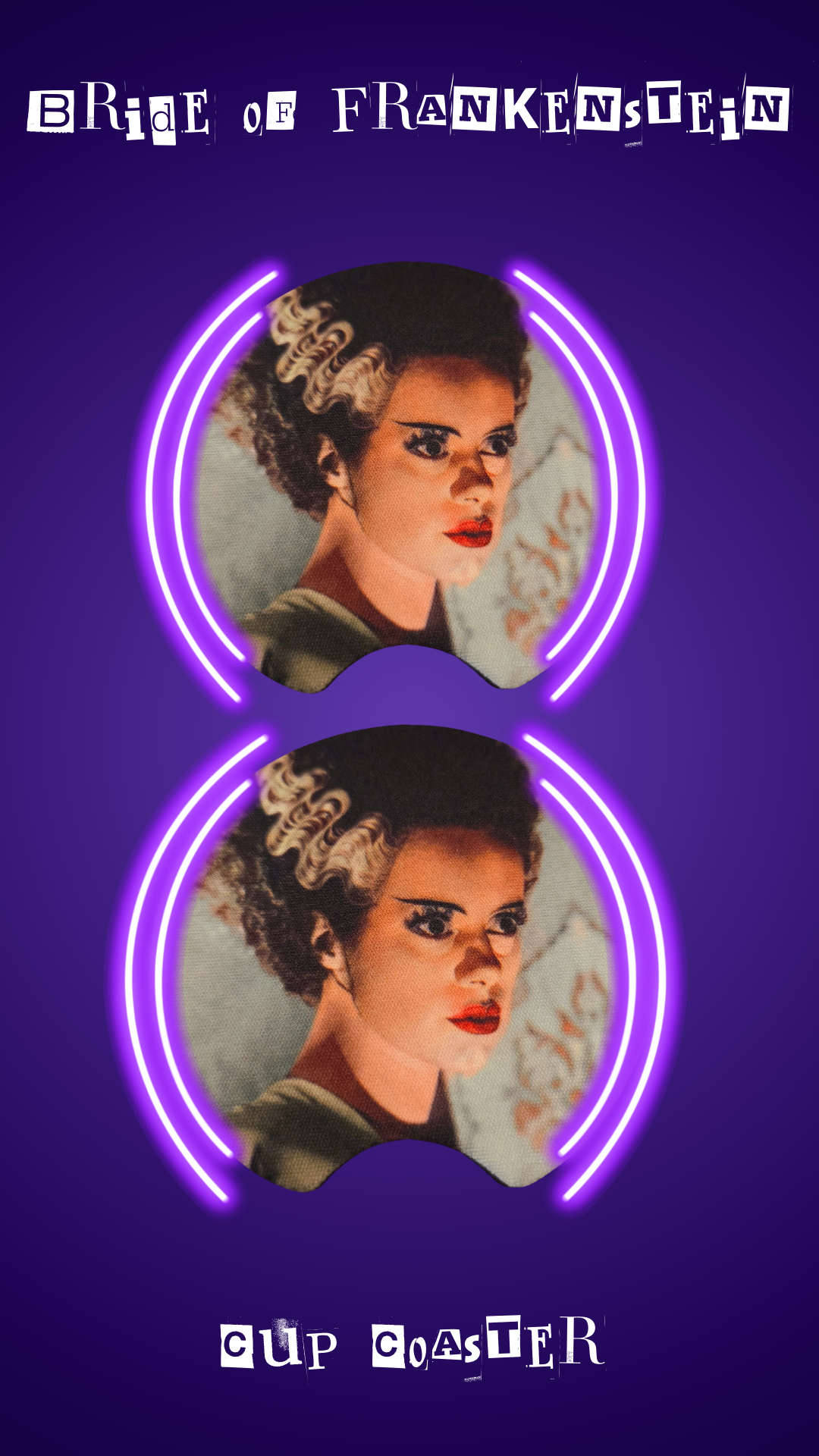 The "Bride of Frankenstein" cup coaster is a delightful and functional homage to the classic 1935 horror film of the same name. This coaster typically features the iconic image of the Bride, portrayed by Elsa Lanchester, with her striking hair streaked with white lightning bolts and an expression that captures her eerie beauty. Made from durable rubber it not only protects your surfaces from drink stains but also adds a touch of vintage horror charm to your home decor. Perfect for fans of classic horror or those who appreciate unique and artistic home accessories, this cup coaster is both a conversation starter and a practical addition to any household.